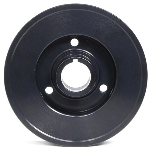 The new damper includes pre-drilled mandrel or accessory drive M10x1.5 bolt holes on a 2.750 inch bolt circle pattern. A TDC mark is also notched and highlighted in white on the pulley side edge. Each Fluidampr performance damper come complete with a corrosion resistant black zinc RoHS finish, then laser engraved with a Fluidampr – Made in the USA logo and SFI 18.1 credential.