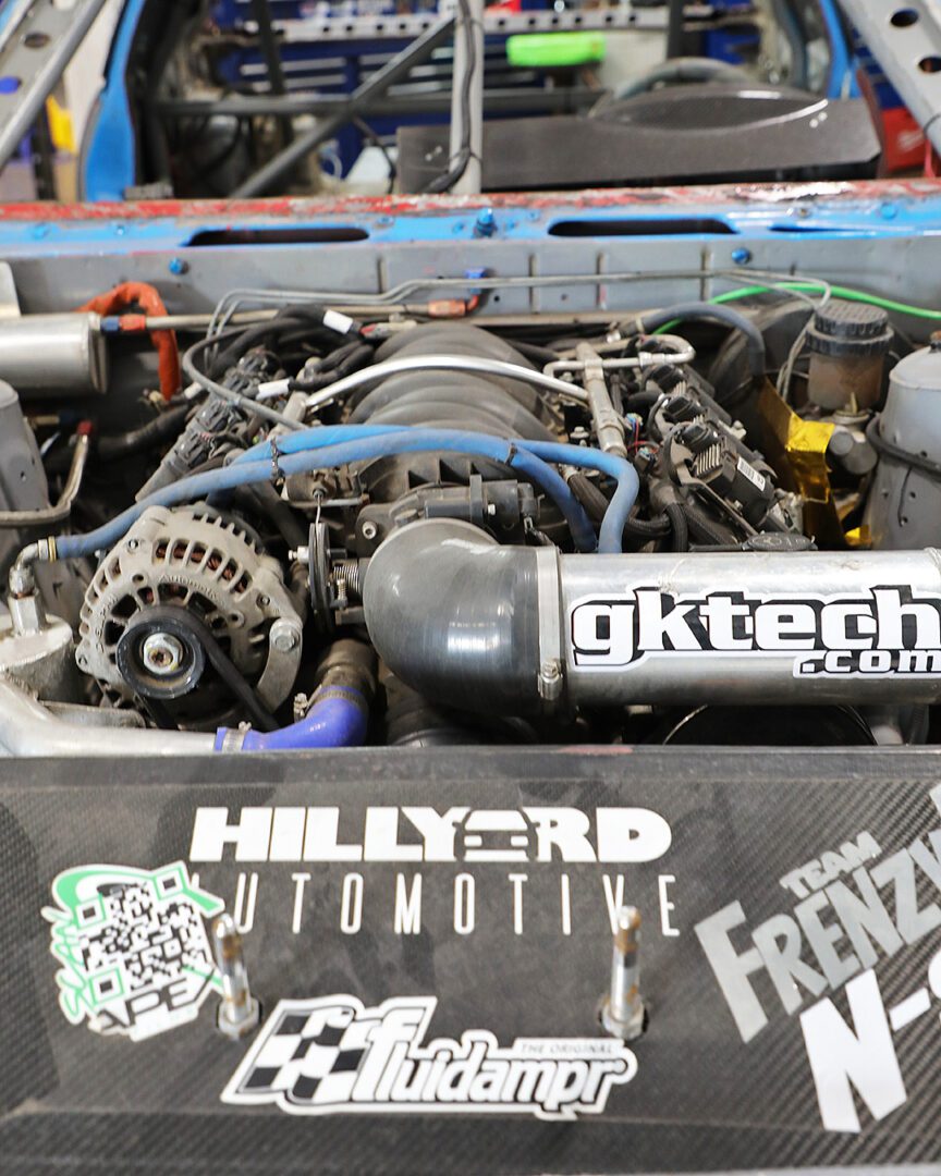 “What we’ve figured out with Nick’s help is that we run an underdrive lower pulley, and what that does for us is it spins the water pump slower and we get less cavitation, we get better cooling,” Downey shares. This simple change allowed his team to maximize reliability while keeping the cars running cooler during long, intense drift sessions.